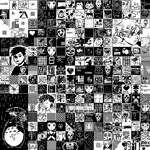 thing you'll encounter is a page with an image like this: It should be noted that glyph imagery is nothing new. Mayans and Egyptians used glyphs, and the word 'glyph' comes from (ancient?) Greek ('carving'). More recently, there is the work of Kenneth Knowlton, who in the 1960's used computers at Bell Labs to create images composed of glyphs. I first encountered one of Knowlton's pictures -- which seemed to combine Chuck Close and the teletype -- at the School of Visual Arts in the early 1990s. The present project does, however, shift the focus of authorship. It is an image-making system that can be altered from all over the Internet. It's not clear who owns the collaborative image. For my part, I encourage you to use it any way you see fit. I look forward to seeing what images develop. Finally, if you don't like the options given to you, please revise the source code. Copy it. Steal it. Share it. Print it. Pretend it's yours. I don't care.